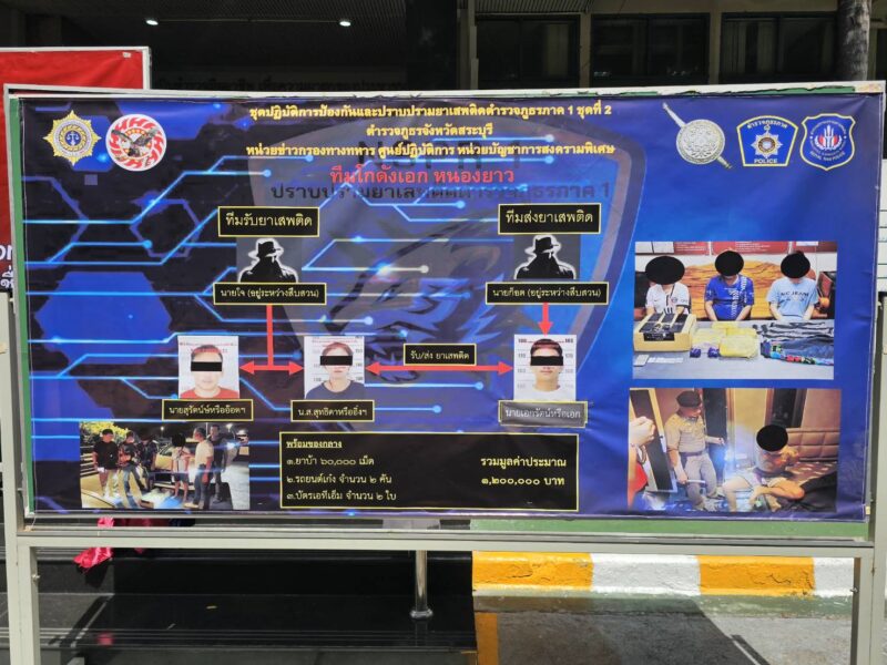 นายเอกรัตน์ (ผู้ต้องหาที่ 3) ได้ขับรถยนต์เก๋งยี่ห้อฮอนด้า รุ่นชีวิค สีเทา (ของกลางลำดับที่ 3) นำยายาบ้าที่ใส่ไว้ในกล่องกระดาษสีนำตาล มาวางไว้ที่จุดนัดหมาย บริเวณริมถนนสาย 3021 ต.หนองยาว อ.เมือง จว.สระบุรี เมื่อวางกล่องยาบ้าเรียบร้อยแล้วได้รีบขับรถออกไป หลังจากนั้นอีกประมาณ 10 นาทีต่อมา ได้มีนายสุรัตน์ (ผู้ต้องหาที่ 1) และน.ส.สุทธิดา (ผู้ต้องหาที่ 2) ขับรถยนต์เก๋งยี่ห้อฮอนด้า รุ่นชีวิค สีขาว (ของกลางลำดับที่ 4) มายังจุดที่วางกล่องยาบ้าไว้ และ น.ส.สุทธิดา เป็นผู้ลงมาหยิบกล่องยาบ้าขึ้นรถแล้วพากันขับออกไป เมื่อมีการส่งและรับยาบ้ากันเรียบร้อยแล้ว เจ้าหน้าที่ตำรวจและหน่วยร่วมปฏิบัติซึ่งได้สะกดรอยติดตามดูพฤติการณ์ในทุกขั้นตอนอยู่แล้ว ได้ติดตามรถยนต์ทั้ง 2 คันดังกล่าว เมื่อถึงสถานที่ปลอดภัย จึงได้แสดงตัวและเข้าทำการตรวจค้นรถยนต์คันที่นายสุรัตน์ และ น.ส.สุทธิดา นำมารับยาบ้า ผลการตรวจค้นพบยาบ้า จำนวน 60,000 เม็ด บรรจุอยู่ในกล่องวางอยู่ในรถ ส่วนเจ้าหน้าที่อีกชุดหนึ่งที่ได้สะกดรอยติดตามรถยนต์ของนายเอกรัตน์ (ผู้ต้องหาที่ 3) ซึ่งเมื่อนำมายาบ้ามาวางไว้ที่จุดนัดหมายแล้วได้เดินทางไปยังบ้านหลังหนึ่งอยู่ในพื้นที่ อ.เฉลิมพระเกียรติ จว.สระบุรี เจ้าหน้าที่ตำรวจได้ขอหมายค้นจากศาลจังหวัดสระบุรีเข้าทำการตรวจค้น ผลการตรวจค้นภายในบ้านและภายในรถยนต์ พบเคตามีนน้ำหนักรวมประมาณ 1.91 กรัม จึงทำการจับกุมแจ้งข้อกล่าวหาผู้ต้องหาทั้ง 3 คน ในชั้นจับกุมผู้ต้องหาทั้งหมดให้การรับสารภาพตามข้อกล่าววหา ซึ่งเจ้าหน้าที่ตำรวจจจะได้ทำการสืบสวนขยายผลหาตัวผู้สมคบ สนับสนุน และช่วยเหลือในคดีนี้ต่อไป