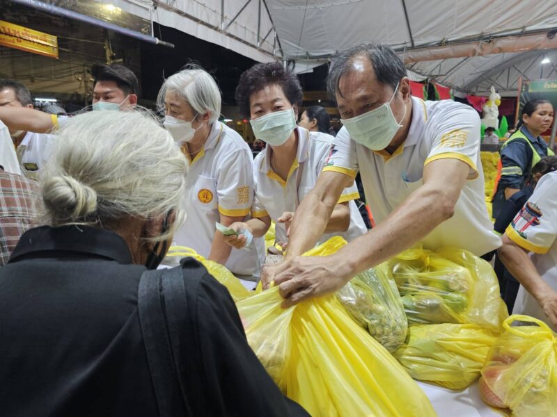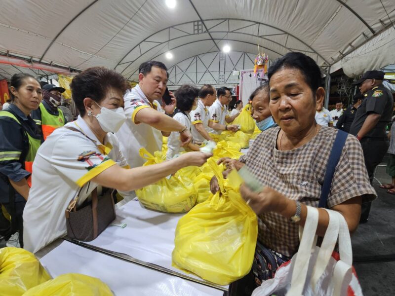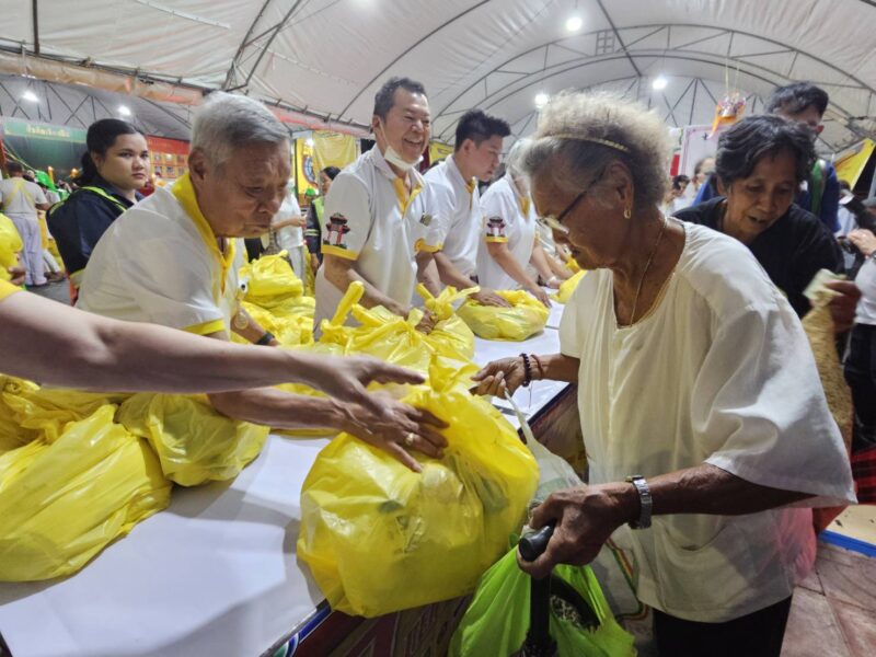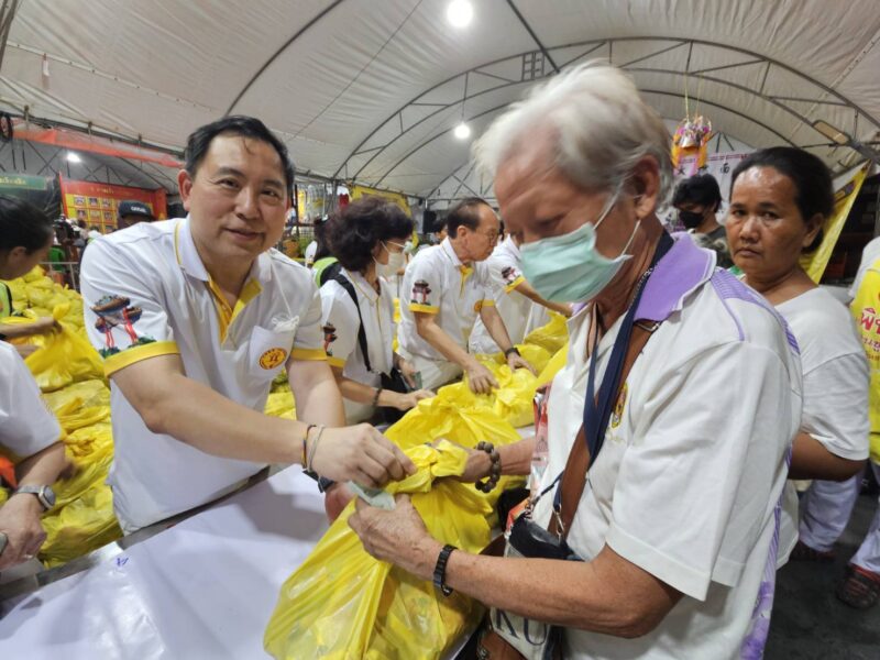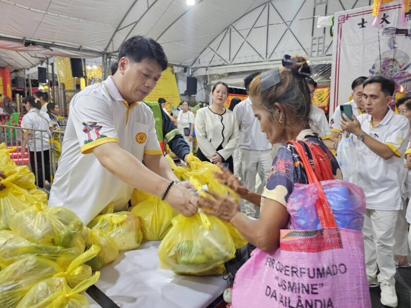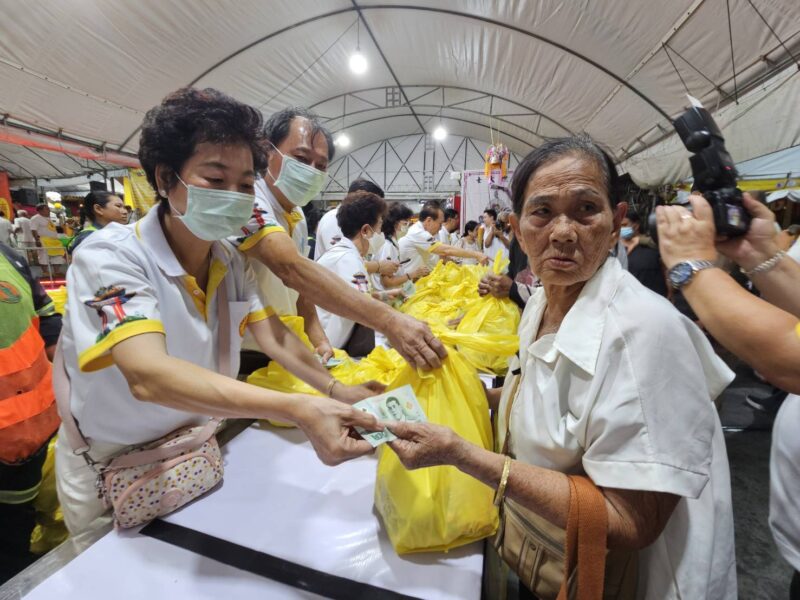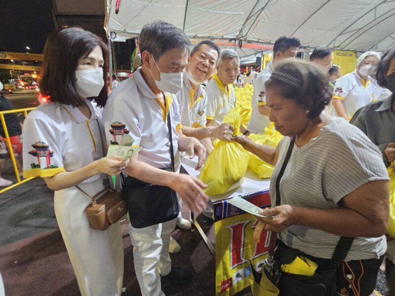 เวลา 18:00 น. คณะเจ้าภาพและกรรมการจัดงานประเพณีงานเจ ได้แจกทานสิ่งของและเงินค่ารถ ให้กับประชาชนผู้ที่ยังขาดแคลนที่มารอรับ กว่า 1,000 ชุด หลังจากนั้น