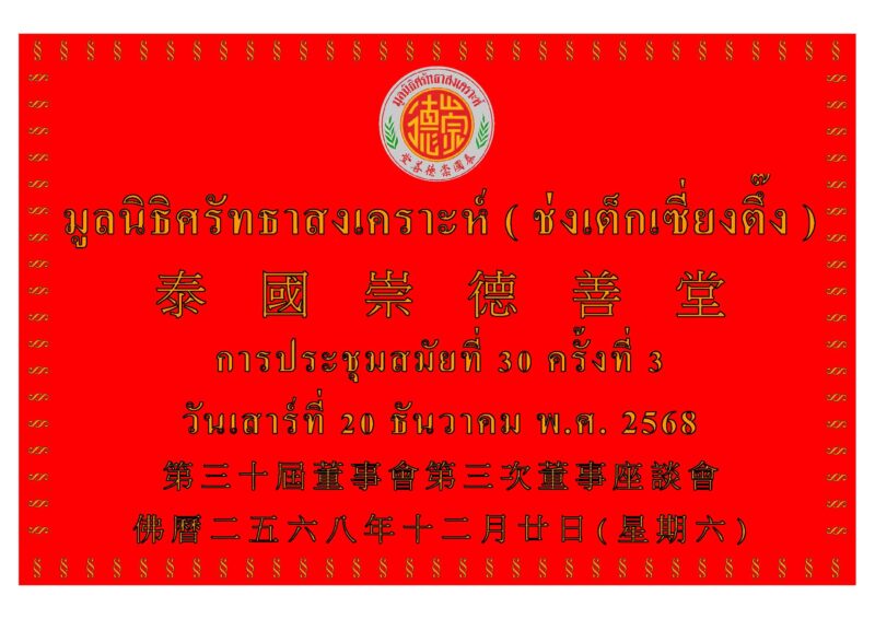 เมื่อเวลา 10:30 น.วันที่ 20 ธันวาคม พ.ศ.2568 ณ ชั้น 2 ห้องนพวงศ์ 1 โรงแรมเดอะทวินทาวเวอร์ ถนนพระราม 6 เขตปทุมวัน กรุงเทพฯ คณะผู้บริหารมูลนิธิ ศรัทธาสงเคราะห์ ช่งเต็กเซี่ยงตึ๊ง นำโดย คุณบวรทัต พิชยธนกิจ 董事長李楚雄先生 เป็นประธานในที่ประชุมฯ พร้อมด้วย ประธานกิตติมศักดิ์ผู้ทรงเกียรติถาวร/ ที่ปรึกษา คุณประพันธ์ โลหวิบูลย์กิจ ,永遠名譽董事長兼參議李振欽先生 ประธานเกียรติคุณผู้ทรงเกียรติถาวร คุณบุญชัย ลิขิตธนวงศ์ 永遠榮董事長李岳發先生 รองประธานฯ คุณมนตรี โลหวิบูลย์กิจและภรรยา 李振來先生王妙嬋伉儷 คุณสว่าง ตั้งพงศ์ 陳仁傑先生 คุณซื่อเฮี้ยง เล้า 劉賜雄先生 รองประธานฯควบเหรัญญิก คุณพิพัฒน์ กนกนิตย์อนันต์ 文國華先生 รองประธานฯ คุณวิวัฒน์ โลหวิบูลย์กิจ,李劍鵬先生 คุณสิริรัตน์ แซ่ลิ้ม 李林金枝女士 กรรมการบริหารฯ คุณสุรชัย โลหวิบูลย์กิจ 李國臣先生 คุณศิริวัฒน์ โลหวิบูลย์กิจ 李劍榮先生 คุณถาวร ลีรุ่งมณี 李永根先生,กรรมการ คุณธนัท หฤษฎีชวลิต 李楚堅先生 และแขกผู้มีเกียรติ เข้าร่วมในที่ประชุมฯ