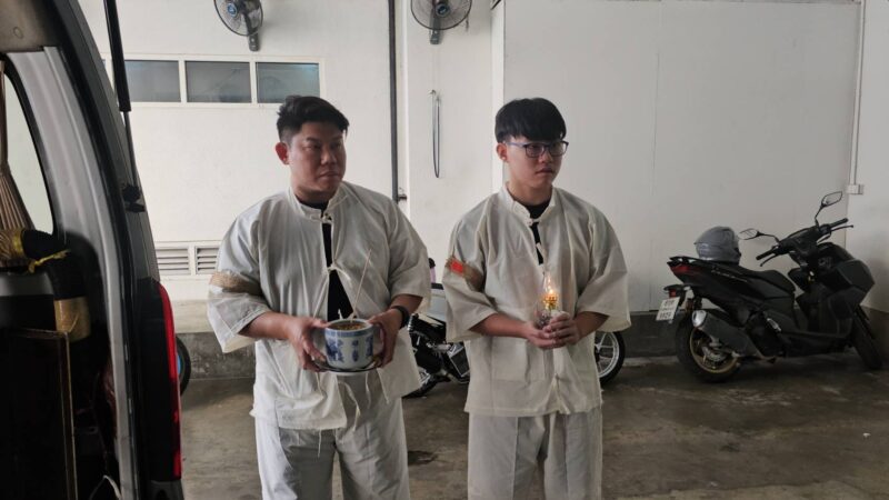 ( จุดเทียนด้านหน้าโต๊ะผู้วายชนม์ )