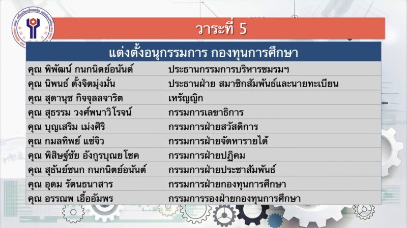 [ วาระที่ 5 ] แต่งตั้งอนุกรรมการ กองทุนการศึกษา มีรายชื่อและตำแหน่ง ดังต่อไปนี้