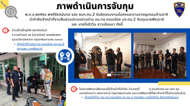 ลงวันที่ 22 ก.ย.2568 เป็นนายหน้าประสานงานขอวีซ่าให้กับนายโซอิดฯ เข้าประเทศเมียนมาและประสานงานกับนายฟิรเดาส์ฯ ในการเดินทางข้ามชายแดนทางช่องทางธรรมชาติ ต่อมา พ.ต.อ.พงศ์ธร พงศ์รัชตนันทน์ รอง ผบก.ตม.2 ได้นำกำลัง ฝ่ายสืบสวน ด่าน ตม.ทอ.ดอนเมือง และกำลังของ กก.๑ บก.สส.สตม. ภายใต้การนำของ พ.ต.อ.ธวัชชัย นรินรัตน์ ผกก.1 บก.สส. สตม. เพื่อร่วมกันเข้าจับกุมนายฟิรเดาส์ฯ ผู้ต้องหาตามหมายจับได้ที่อพาร์ทเม้นท์ ภายในซอยรามคำแหง 65 ซึ่งเป็นห้องพักของนายฟิรเดาส์ฯ จากการตรวจค้นห้องเช่าพบสัญญาเช่าบ้านหลังหนึ่งภายใน ซ.รามคำแหง 24 ที่นายฟิรเดาส์ฯ ใช้เป็นแหล่งพักพิงคนต่างด้าว ก่อนส่งเดินทางล่องใต้ไปยังจังหวัดชายแดนภาคใต้ ซึ่งต่อมาเจ้าหน้าที่ตำรวจตรวจคนเข้าเมืองชุดจับกุมได้นำนายฟิรเดาส์ฯ ค้นบ้านเช่าหลังดังกล่าว พบนายโจ (สงวนนามสกุล) ชาวเมียนมา อายุประมาณ 40 ปี หลบอยู่ในบ้าน จากการสอบถามนายฟิรเดาส์ฯ และนายโจ ให้การรับว่านายโจเป็นบุคคลต่างด้าวที่หลบหนีเข้าเมืองผิดกฎหมาย โดยเดินทางกลับมาจากไปทำงานที่ประเทศมาเลเซีย และต้องการจะกลับประเทศเมียนมา มีขบวนการนำพามาส่งที่บ้านเช่าหลังนี้เพื่อพักไว้ ก่อนที่จะมีรถมารับไปส่งที่ชายแดนต่อไป เจ้าหน้าที่ตำรวจชุดจับกุมจึงได้จับกุมนายฟิรเดาส์ฯ ตามหมายจับดังกล่าว นำตัวส่งพนักงานสอบสวน สน.ดอนเมือง และจับกุมนายโจ นำตัวส่งพนักงานสอบสวน สน.หัวหมาก ดำเนินคดีในข้อหา เป็นคนต่างด้าวเดินทางเข้ามาและอยู่ในราชอาณาจักรโดยไม่ได้รับอนุญาต
