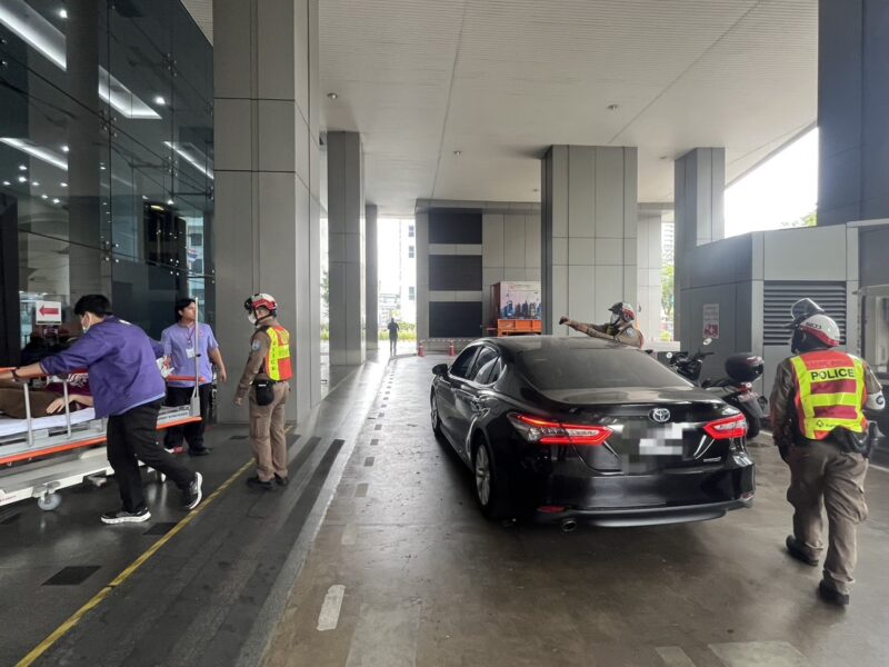 ต่อมา เจ้าหน้าที่ตำรวจจราจรได้ตรวจสอบและพบว่ารถคันดังกล่าว จอดอยู่บริเวณริมถนนพระราม 4 ขาเข้า ใกล้ด่วนพระราม 4 จึงได้เข้าให้ความช่วยเหลือ โดยเจ้าหน้าที่ตำรวจจราจรได้ย้ายหญิงคนดังกล่าว มานั่งที่บริเวณเบาะด้านหลัง แล้ว จ.ส.ต.ธิติวัฒน์ ภะคินี เมฆา 6620 จึงทำหน้าที่เป็นพลขับ จ.ส.ต.พงศธร บุญล้อม เมฆา 6615 พร้อมด้วยเจ้าหน้าที่จราจรอีก 3 นาย 6613 6633 6639 ช่วยกันขับรถนำเปิดทาง ไปส่งที่โรงพยาบาลจุฬาฯ และอยู่ดูแลจนหญิงคนดังกล่าวอาการดีขึ้นและมั่นใจว่าปลอดภัย จึงได้มอบกุญแจรถและแนะนำให้ติดต่อญาติเป็นลำดับต่อไป